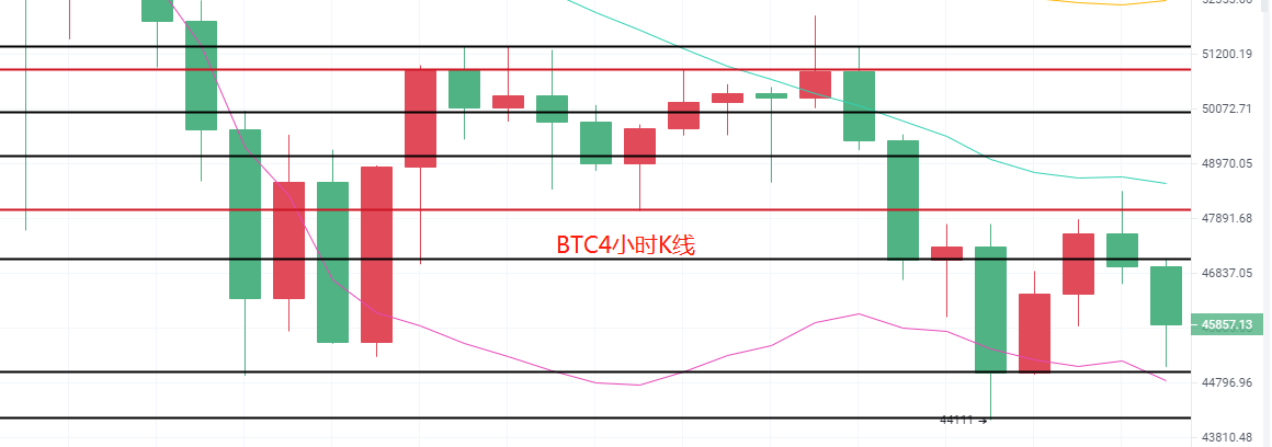 昨日比特币47300-46500两个支撑点相继突破,辰逸也说过KDJ和MACD还未触底底部震荡阶段,那么我们再看看今日的MACD放量以后DIF和DEA处于高位运行,KDJ已经触底,均线向下拐头两两交替下行,而四小时均线已经在底部运行一个周期了,MACD放量下行,DIF目前也没有明显上行趋势,所以辰逸判断比特币会下行冲击42450支撑位