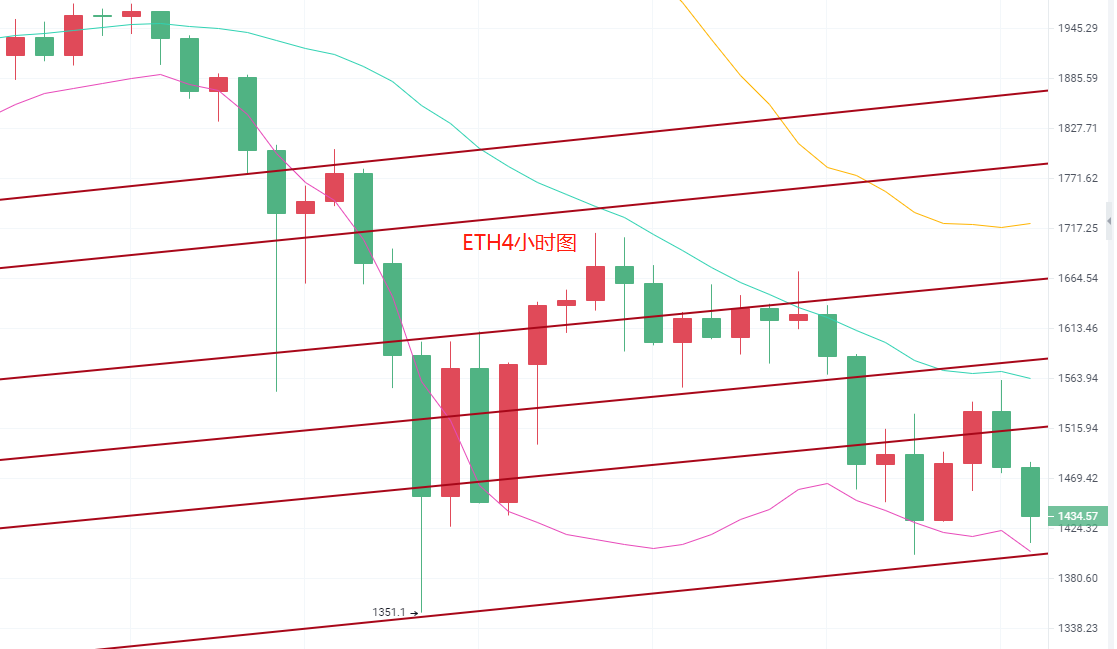 昨日以太1445的关口说破就破,来的很快单边下跌跨度两百多美金,最低至1400位置没有破1390关口,也是最佳的进场点,我们先看日K线目前下行突破布林带下轨线,MACD放量下行,KDJ触底,4小时K线也距离布林带下轨很近位置在1390关口,破了下方空间就打开了,MACD方量以后DIF和DEA处于一个背离状态,好在均线已经触底下行空间有限,不用太过于紧张
