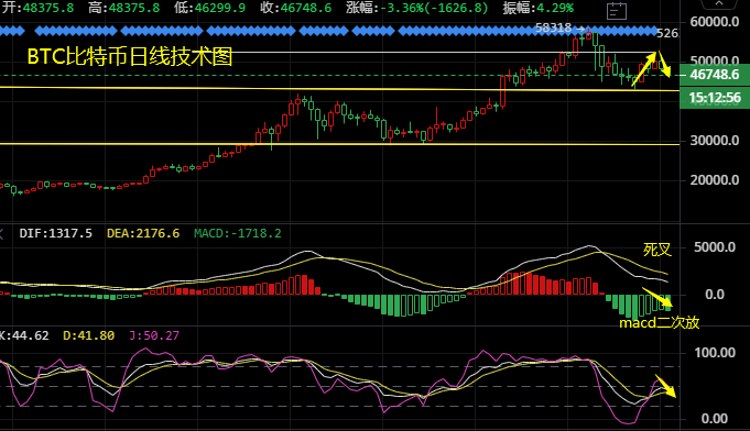 2、回落在46600美元一带短多,止损46100,目标47500附近;