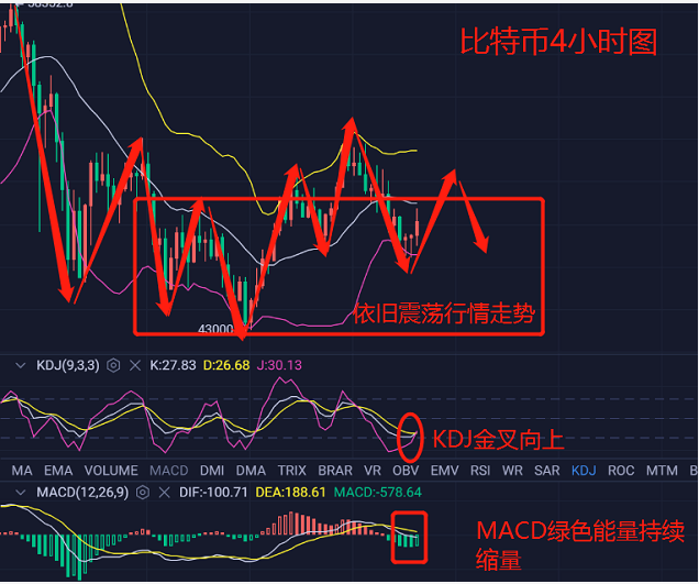 在看看1小时k线图上方48600美元价格有压力,并且保持4小时布林带中下轨价格的运行,而底部金叉向上结合,带动nacd绿色下跌能量持续缩量,综合来看比特币在午夜关注一下50000美元的压力,不排除4小时形态有v形态底部走出三浪运行。