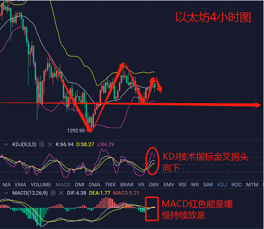 再来看看3月6号凌晨1点开始分析以太坊的行情价格走势图,以太坊从1509美元价格附近开始反弹向上并且连续收取3连阳后继续上涨,最高触及1590美元价格附近开始收跌,而DIF指标快慢线交叉向下带动红色能量缩量,综合来看以太坊在3月6号全天处于100美元区间震荡走势,下方1500美元得到了有效的支撑,而钱楚基在上一篇文章的以太坊策略是完美的拿下了接近90个点的利润,在看看4小时行情走势图以太坊三线开始走平,最低从1456美元下轨反弹向上触及布林带上轨附近形成了一波v形态走势,并且KDJ指标金叉达到了90轴值价格附近后有拐头向下死叉的动能迹象,而MACD红色能量震荡走量,综合来判断以太坊处于低位盘整阶段,那么在3.12来临的时候不排除还有进一步的下跌。