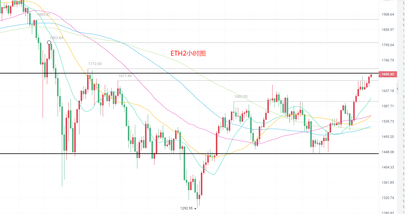 午后目前ETH向上冲击1700,我们来看2小时K线处于布林带上轨下放线上散发,KDJ随向上开口,但是比较疲软说明上方压力比较强,均线MA15冲击太快,其他四条均线比较保守,两小时来看1700是一个比较强的压力位,我们在看30分钟K线已经突破布林带上轨,MACD放量刚结束,DIF形成黄金交叉点即将交叉DEA,均线MA15上行,MA120却在下压,但是我们还是要做好两手准备,1695破了上看1706-1725,不破下看1776-1665
