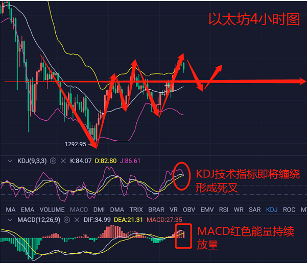 从以太坊4小时走势图来看,布林带整轨呈平行开口的趋势,MA5均线拐头向上在行情下方形成支撑,当前行情在布林中轨的上方震荡,布林上轨的压制比较明显,附图指标KDJ三线在70轴值的上方运行,MACD快慢线在0轴上方带动多头柱能持续放量。