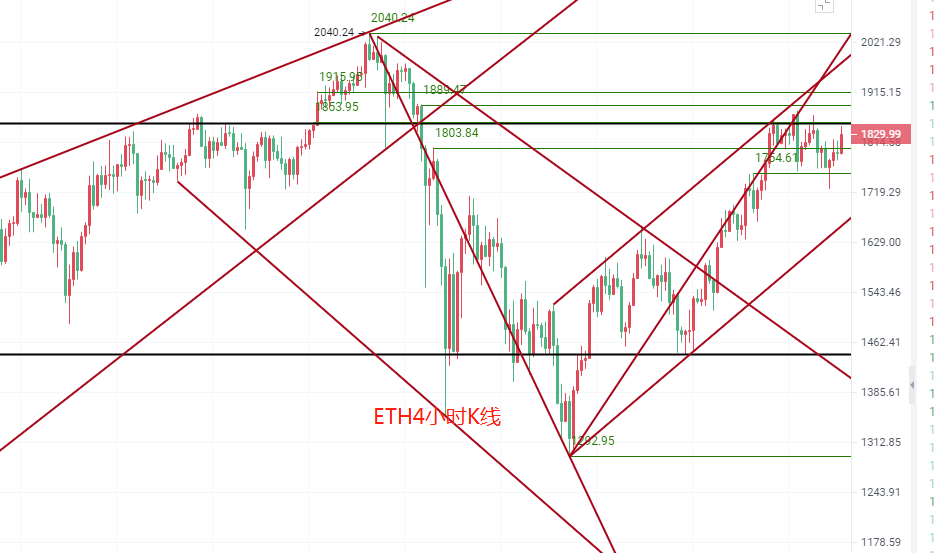 我们来看昨日以太坊单边下跌近150美金,日K线虽然已经突破布林带中轨线上运行,但是今日破新高难度较大,上方重点关注1950即可,MACD缩量DIF和DEA向上运行,KDJ收口趋势明显,均线目前形成一个缓慢上行发散的状态,4小时K线开始向上走过布林带中轨,KDJ黄金交叉点已经成型向上发散,MACD放量顶背离上行,综上判断3月1号以来以太的底部不断被抬高,所以辰逸,上看1853-1880-1916,破位继续上看1950,下放关注1790-1755-1725