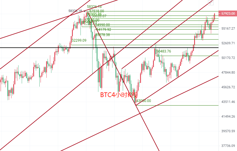 早上七点比特币重回巅峰站在了58000美金的位置,昨日比特币走势从30分钟可以很直观看出一个V字型上下幅度3100+美金,我们来看日K线现在正在冲击布林带上轨,也就是目前比特币最高位58400这个位置,MACD顶背离放量上行,KDJ向上发散,均线被强势下拉,4小时K线缩量上行,KDJ向上形成黄金交叉点,K线已经触及到布林带上轨,MA五日均线除了MA120在横盘以外,其他四条均线在向上发散,MACD缩量上行,辰逸综合判断给出的参考建议是抓一波小回调,然后看新高,上方看破位新高以后看58450-59000-59950,不破新高回调下看57500-57000-56000