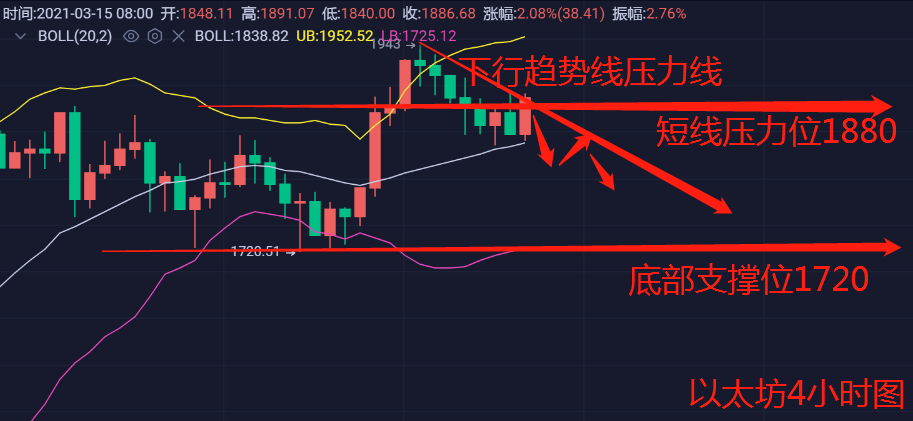 以太坊上方1890美元空单进场,突破1910美元补仓空,目标看1840-1800美元,止损1940美元。