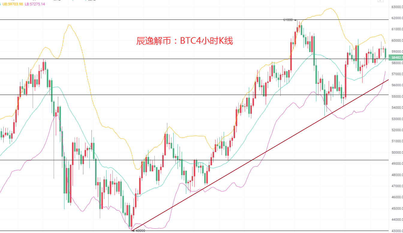 比特币昨日算是单边上行的一个趋势,从最低57822美金涨至59900美金,而后又回调至58000关口开始震荡,说明上涨动力缺乏,我们来看日K线布林带UB和LB开始缓慢收口,BOLL一直坚守在55000关口附近,MACD顶背离开始放量,DIF和DEA黄金交叉点成型,KDJ收口迹象不明显,均线目前有MA60坚守46300和MA120坚守36000做支撑短期内不会出现大范围跳水,我们前期的思路依旧是低多为主高空为辅,上看59250-59950-60550,下看57950-57350-56650