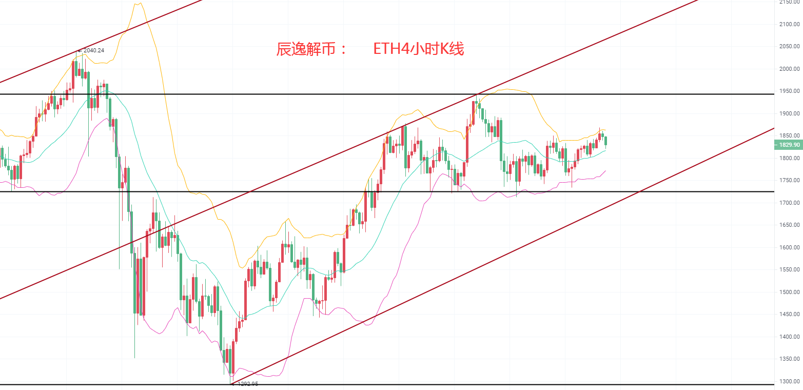 以太坊昨日冲高至1868以求突破箱体震荡,而后失败回调重归箱体震荡,冲击失败伴随的自然是回调继续震荡,所以短期内依旧会徘徊于1795上下,我们来看日K线目前处于布林带中轨BOLL1735之上,MACD缩量减少,KDJ开始在下方收口,4小时K线开始冲击BOLL1815支撑点,其他指标看空,短期内我们下看LB支撑点1770