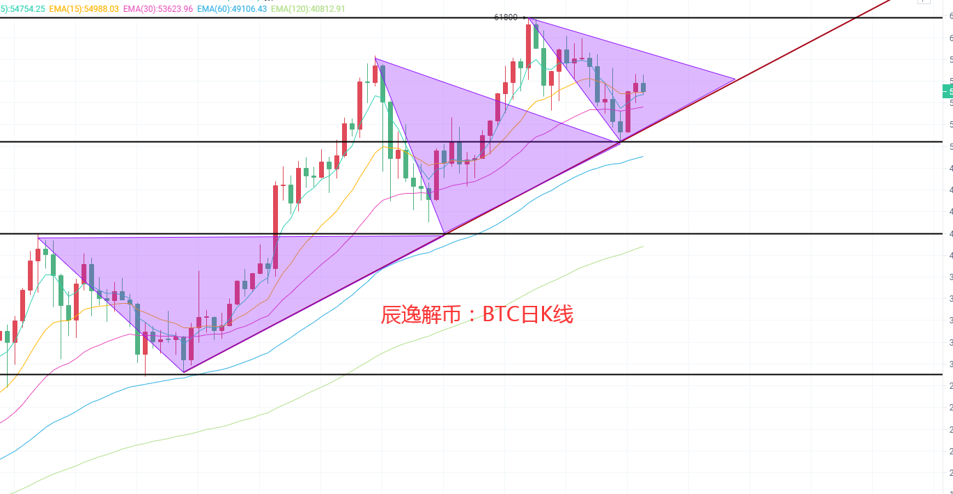 昨日我说道比特币再现三角关口并没有出现破位,而是三角口开始收缩,日线我们可以看住波动不是很大,K线冲击布林带中轨(56300)以后开始来回震荡,KDJ向上发散,MACD顶背离周期越来越长,放量减少以后DIF和DEA开始高位线下发散,移动平均线目前只有EMA5和EMA15交叉苦苦支撑在54800-55000双支撑关口,这也是目前技术面横盘震荡的重要因素