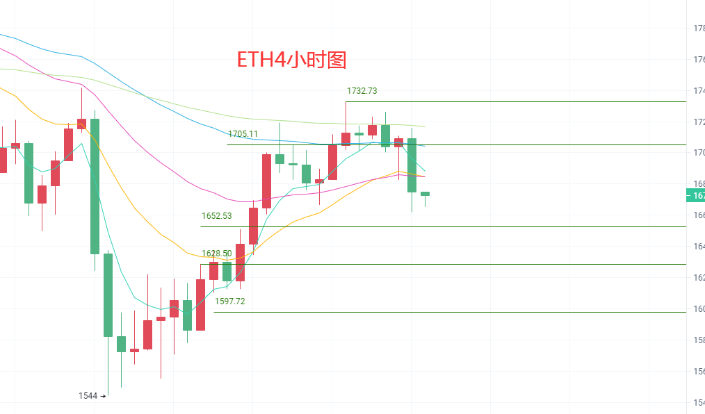 再来看以太坊4小时K线目前触及布林带中轨(1670)以后开始受到支撑的阻力回调,不过这个阻力并不强,KDJ正在快速的向下发散,MACD缩量减少,两极分化结束以后DIF就开始拐头向下,移动平均线MA5目前是表现最活跃的,在上行过程中重合MA60(1705)以后拐头向下上方形成了1705-1716双压力位,5-15-30开始向下发散三条均线在1685重合度最高,所以辰逸短期内建议高空为主,低多为辅,上看1705-1736-1758,下看1652-1630-1598任意一个压力或者支撑位不破即回调