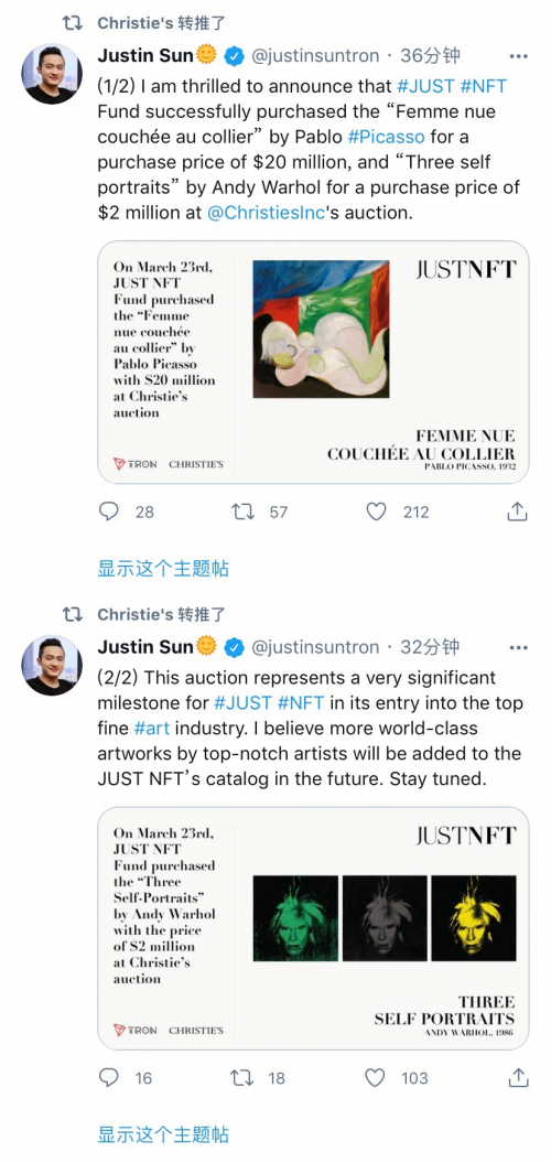 近日,波场(Tron)创始人兼BitTorrent CEO孙宇晨通过推文宣布,由其创办的JUST NFT基金在伦敦佳士得20世纪艺术晚拍以2000万美元(1.3亿人民币)和200万美元(1300万人民币)的价格,分别拍下毕加索的《戴项链的躺卧裸女》(Femme nue couchée au collier)和安迪·沃霍尔的《三幅自画像》(Three self portraits)。