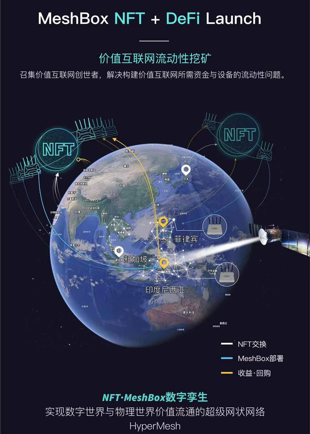 MeshBox作为物理到数字世界的网关,其一一对应的NFT可以将MeshBox的价值与使用价值进行分离。作为分布式价值互联网的创世者,持有DNET不仅拥有meshDAO投票席位,还可以质押进行流动性挖矿与收益耕作。NFT对应的MeshBox设备经过meshDAO组织投票部署到东南亚等让MeshBox更具使用价值的新兴市场。MeshBox基金会用创新的NFT+DeFi流动性挖矿模式为构建全球价值互联网解决了设备与资金的流动性问题,并为所有参与者带来价值和福音,这将加快通过HyperMesh基础架构部署价值互联网,从而为更多人提供付得起的互联网服务和应用,为全球消除数字鸿沟。