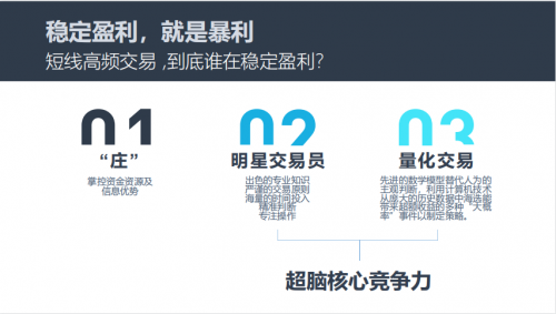 超脑量化的核心竞争力是具备出色的专业知识、严谨的交易原则、海量的时间投入、精准判断和专注操作等能力的明星交易员(KOL)和自主研发的拥有先进的数学模型替代人为的主观判断,利用计算机技术从庞大的历史数据中海选能