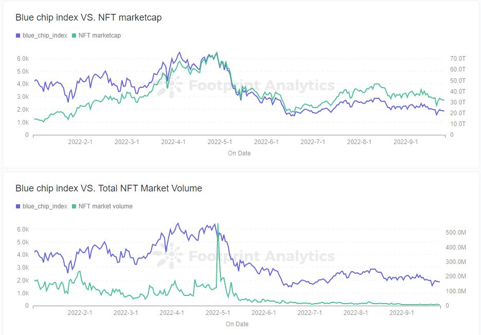 Footprint Analytics - Blue chip index VS. NFT Market Cap or Total NFT Market Volume