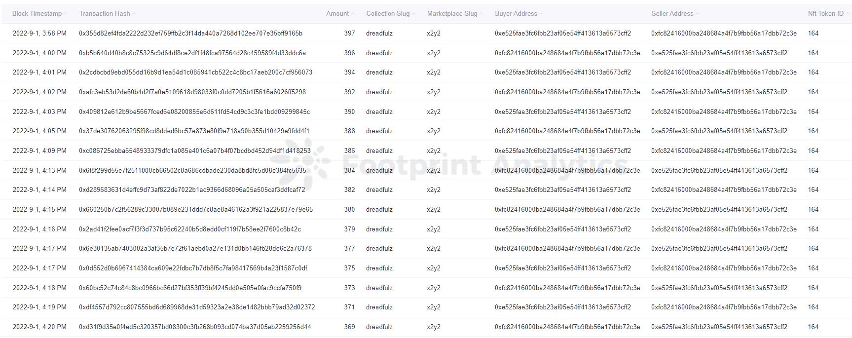 此外,Footprint Analytics 研究的规则发现部分排名靠前的项目存在 wash trading 可疑活动。如下图显示,Dreadfulz NFT 项目在 X2Y2 市场上有 wash trading 行为,同一个 NFT (ID 164)一天内在同一个两个钱包之间来回购买多次,每笔交易售价为 300 左右 ETH。因此,排名靠前的项目结合钱包地址和数据通过规则可以判断项目交易的真实性。