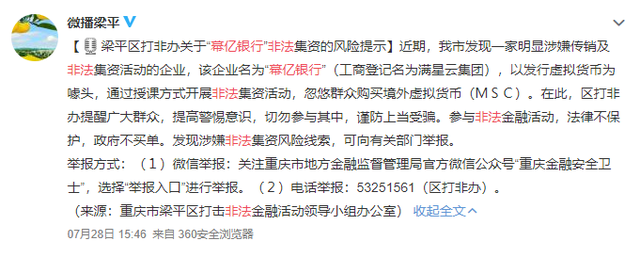 重庆市梁平区打击非法金融活动领导小组办公室关于幕亿银行非法集资的风险提示:近期,我市发现一家明显涉嫌传销及非法集资活动的企业,该企业名为“幕亿银行”(工商登记名为满星云集团),以发行虚拟货币为噱头,通过授课方式开展非法集资活动,忽悠群众购买境外虚拟货币(MSC)。