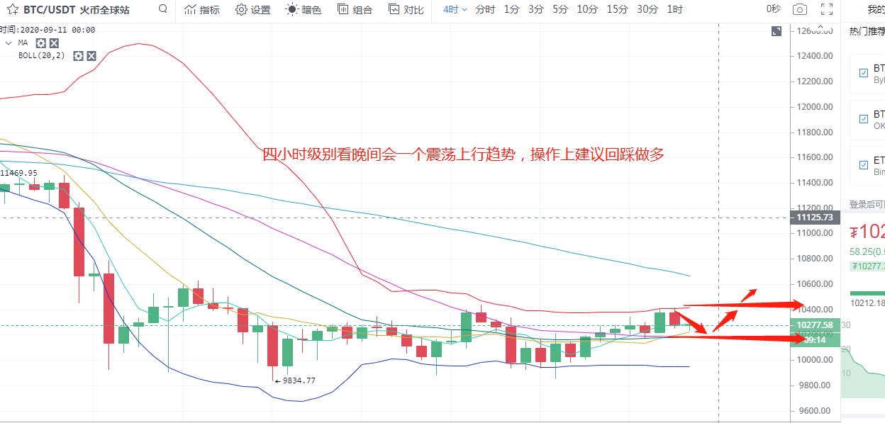 BTC行情分析:今天大饼多次向上探头四小时布林带上轨一线,但并未企稳,开始回落,目前运行在10300一线附近。从四小时图看,布林带缩口,价格不断向上试探,多头开始回暖,5日均线上穿10日均线向上运行,30日均线,10日均线,布林带中轨在币价下方形成强烈支撑。从1小时线看,MACD双线死叉向下,红色动能柱持续放量,短期内会有一个回落的趋势,但综合来看,晚间会是一个震荡上行的趋势。上方压力位10420,下方支撑位10200。操作建议上以回踩做多为主。