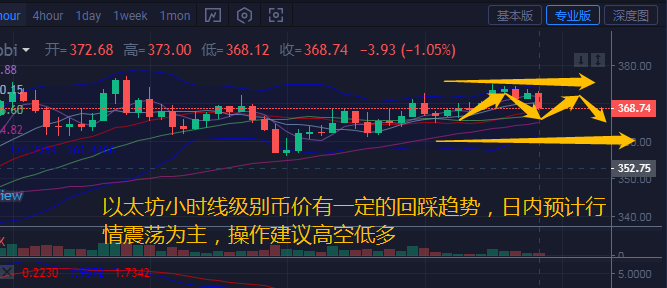 从四小时级别来看,布林带张口向前运行,币价稳定在中轨上方运行。各均线平缓向前运行。附图中MACD快慢线走平运行在零轴上方,绿色动能柱缩量,四小时级别来看,多头反弹趋势减弱。从小时线来看,币价上行触及中轨后再次回踩。附图中MACD快慢线有死叉趋势运行在零轴上方,绿色动能柱缩量。短期币价有一定回踩的趋势。日内关注下方支撑360,上方关注375压制。汐柔建议大家操作震荡区间对待,操作思路高空低多即可。