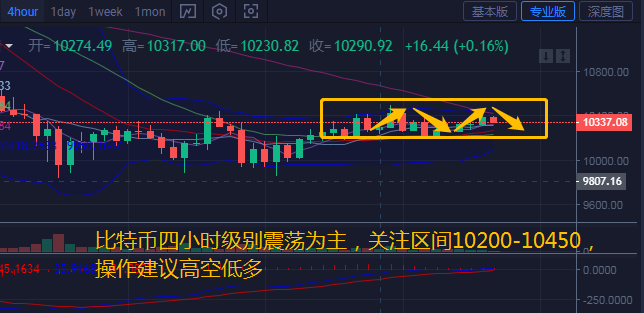 从日线级别来看,布林带张口向下运行,币价稳定在五日均线上方运行。五日均线上行与十日均线粘合运行,附图中MACD快慢线向前运行在零轴下方。日线级别行情稳定运行在10200上方,下方支撑明显。从四小时线级别来看,币价日内稳定在中上轨区域内运行,各均线粘合向前运行,附图中MACD快慢线向前运行在零轴附近。从盘面来看,行情昨日震荡,始终为跌破下方支撑10200,大趋势上方10400-10450区间压制明显,汐柔建议大家日内操作震荡区间对,操作思路高空低多即可。