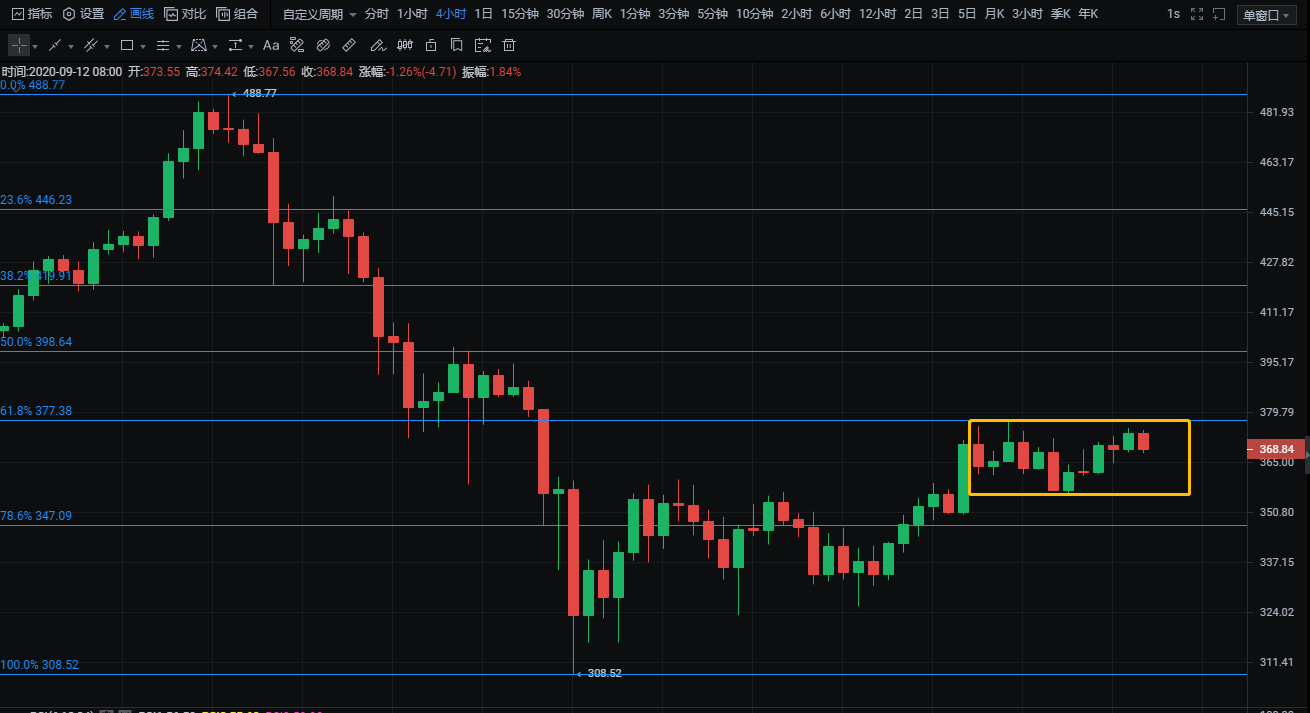 以太坊四小时级别来看价格多次上行至斐波那契指标61.8%于377美金附近受阻回落。布林带呈张口向上运行。5日均线上穿10日均线运行。幅图指标MACD于0轴附近金叉运行,绿色动能柱逐渐减少,KDJ指标三线向下散发,RSI指标三线拐头向下。上方压力位377-390,下方支撑位350-355。操作上高空为主,低多为辅。
