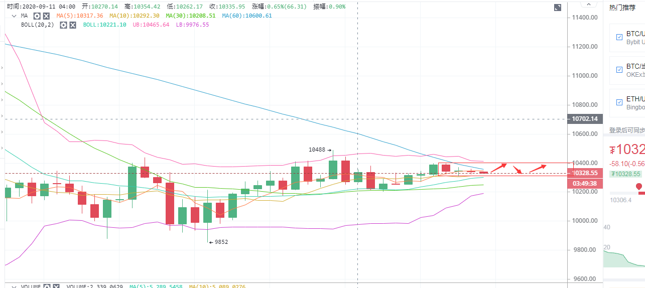 BTC行情分析:今天大饼经过白盘小幅度震荡整理,上下涨跌不过百点,先上涨至10397一线受压回落至10306后触底反弹,目前运行于10340一线附近。从四小时线看,布林带逐步缩口,5日均线上穿10日均线,MACD双线形成金叉,绿色动能柱持续放量,但从下午3点之后的反弹上行来看,力度明显不够,从小时线看,布林带微微缩口,币价运行在布林带中轨一线附近,MACD双线死叉向下,短期还会有一个下行空间。综合来看,彤欣认为晚间行情将延续震荡。操作上高空低多。