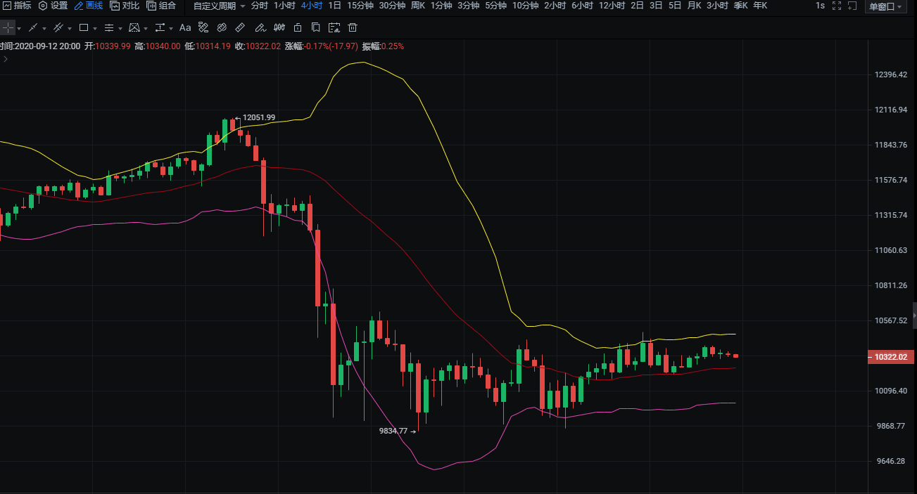 比特币四小时级别来看价格整体趋势依旧维持震荡,布林带平缓运行,价格于中轨上方运行运行,目前价格维持上行通运行道窄幅震荡。短期关注其中轨附近及通道下轨支撑效果,中轨跌破或将去到下轨9980附近寻找新的支撑位。幅图指标MACD于0轴附近金叉运行,绿色动能柱逐渐缩量。RSI指标三线拐头向下运行,KDJ指标三线向下散发。上方压力位10500,下方支撑位10200-9980。
