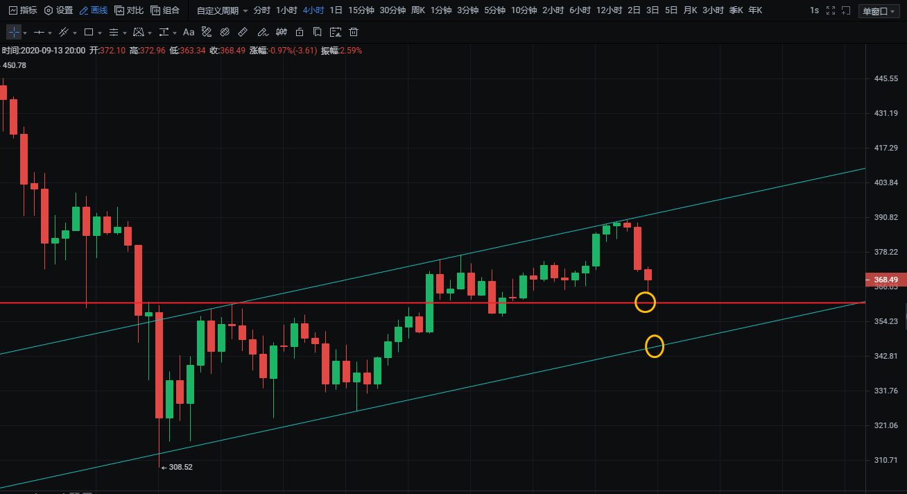 以太坊四小时级别来看价格反弹至上轨390附近受阻回落。布林带呈缩口向上运行。5日10日均线向下拐头。短期价格受上轨及120日均线双重压制。幅图指标MACD于0轴上方有死叉迹象。KDJ指标三线向下散发,RSI指标三线拐头向下。上方压力位400-390,下方支撑位360-355。操作上高空为主,低多为辅。