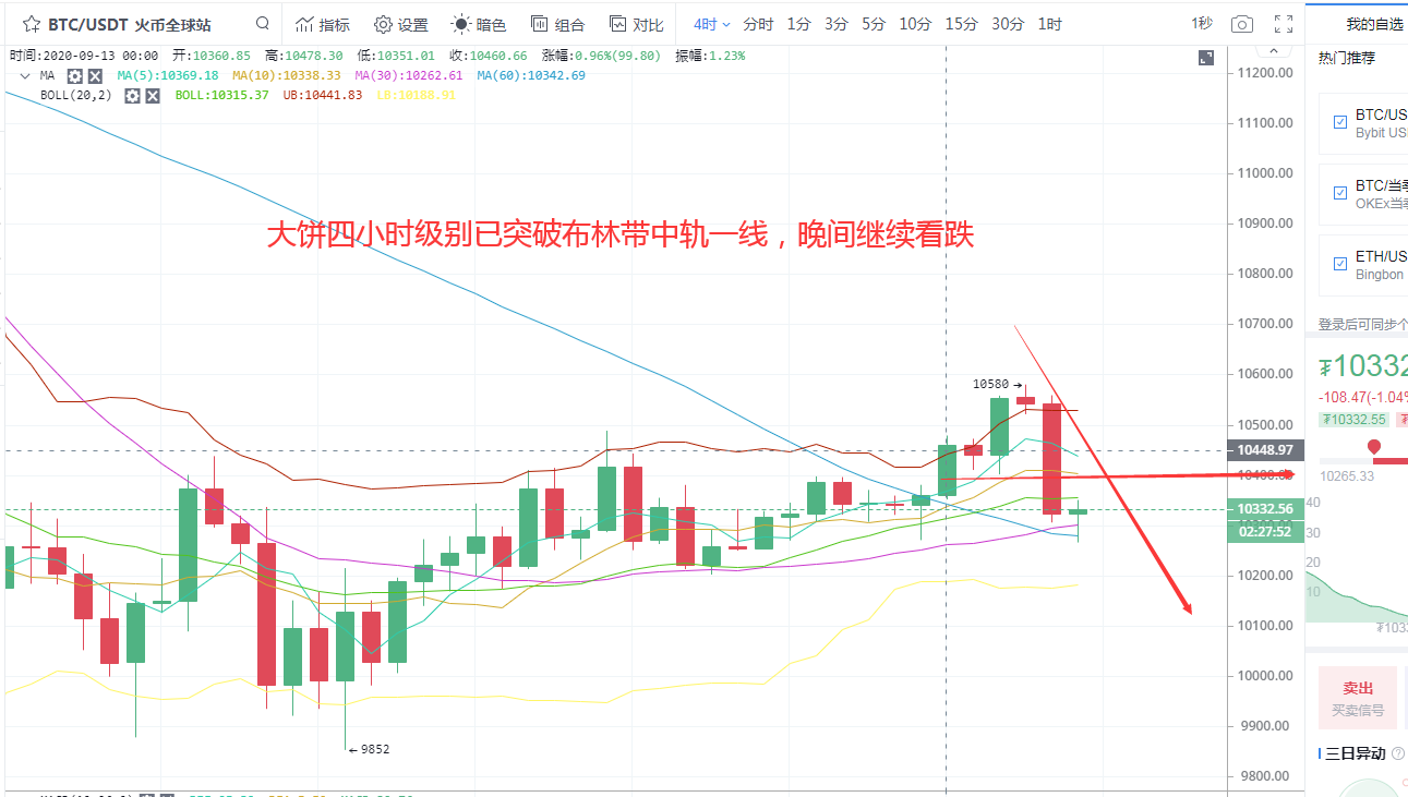 BTC行情分析:大饼在中午12点开始一波暴力拉升上弹至10580一线后,经过5个小时的震荡盘整开始瀑布,回落至10265.33一线后开始小幅度反弹,目前币价运行在10328一线附近。从四小时图看,布林带趋向平行,币价从布林带上轨上方暴跌突破布林带中轨来到60日均线处获得支撑开始反弹,但反弹力量明显不足,空头已夺得主导位置。且各均线皆扭头向下,MACD双线即将形成死叉。晚间行情将进一步下行。操作建议上反弹做空。
