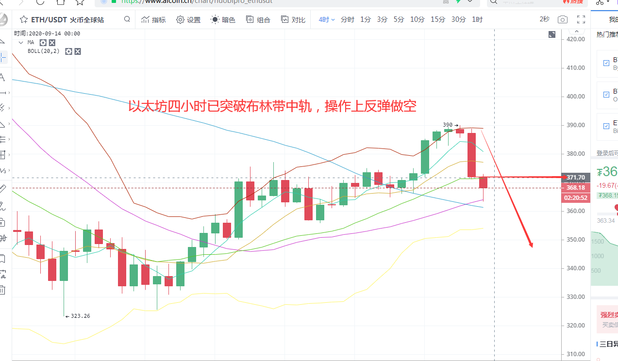 ETH行情分析:今日中午一波反弹拉升至390一线受阻回落后经过5个小时的窄幅震荡后开启暴跌模式,目前运行在367一线附近。从4小时线来看,以太坊目前跌破了布林中轨,空头趋势已经被打开,MACD双线即将形成死叉,KDJ加速向下发,预计晚间还会有一波下跌趋势。晚间操作思路还是以反弹做空为主。