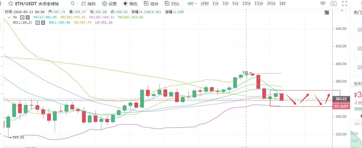 ETH行情分析:以太坊从昨日下午5点开始一路下跌至353.2一线后开始触底反弹,目前运行在360一线附近。从四小时图看,布林带趋向平行,币价在今日凌晨两次想打破布林带下轨支撑,都触底反弹,说明布林带下轨有着强力支撑,且反弹力度不小。预计日内行情将会是一个震荡行情。上方压力位370,下方支撑位350.操作上高空,低多即可。