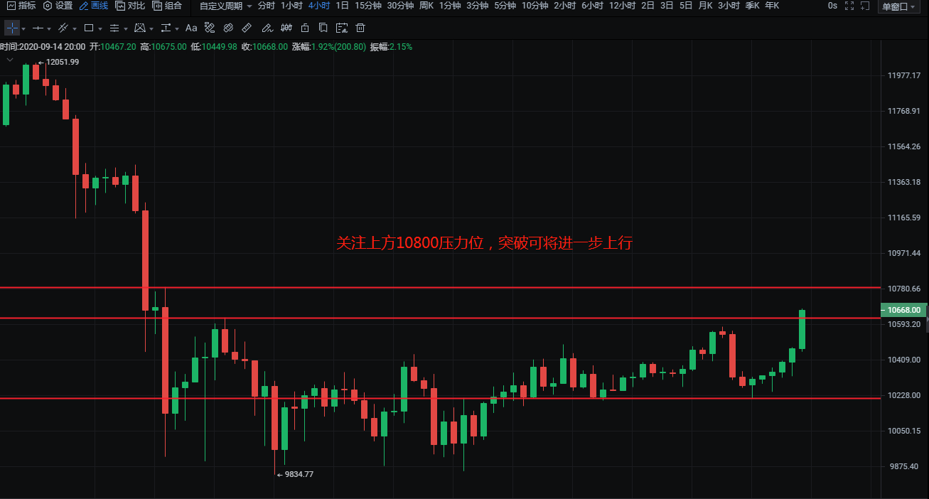 比特币四小时级别来看价格收取6连阳,目前价格于10595美金受阻,多头行情迎来小幅回暖。价格于布林带上轨上方运行。晚间关注价格能否站稳布林带上方运行。幅图指标MACD于0轴上方有金叉迹象,RSI指标三线拐头向上运行,KDJ指标三线向上散发。上方压力位11000-10800,下方支撑位10350-10200。晚间继续高空低多为主。
