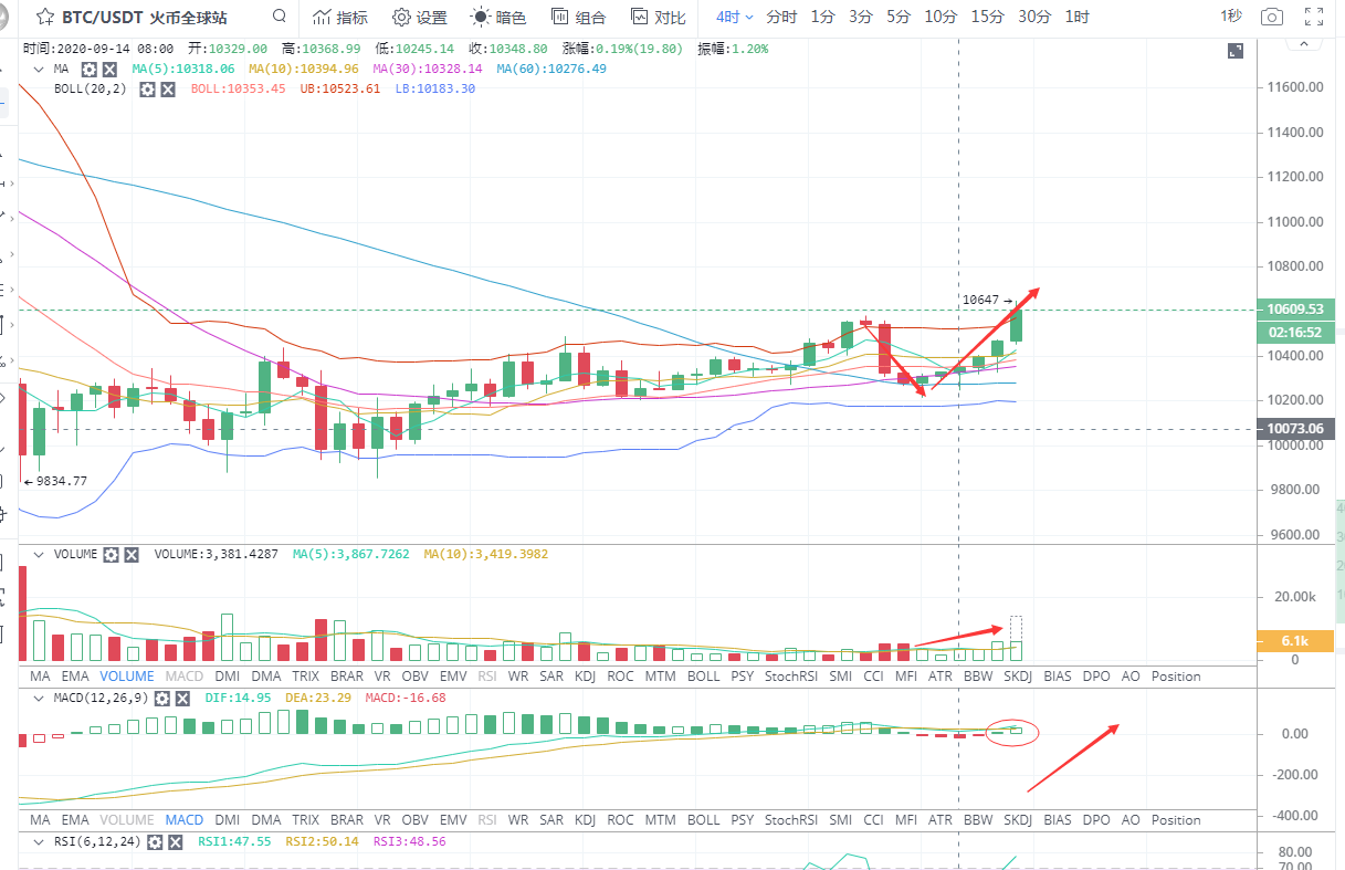 BTC行情分析:大饼在下午盘整后开始开启了暴涨模式,从下午5点开始一路上行至10647一线受阻回落至10609一线。从四小时线看,开始了六连阳模式,上涨力度逐渐加大,比特币高点不断刷高。布林带张口,币价运行在布林带上轨一线。MACD金叉运行,成交量逐渐增多。整体上来看多头占有很大的优势,预计晚间行情还将创新高。操作上直接做多.