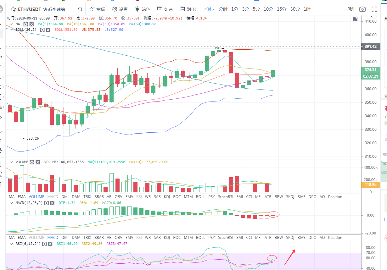 ETH行情分析:以太坊从下午5点开始一路上行至376.33一线受阻回落374.6一线。从4小时图看,布林带微微缩口,5日均线扭头向上。MACD双线即将形成金叉,RSI三线金叉向上。预计晚间还将创新高。操作上直接做多。