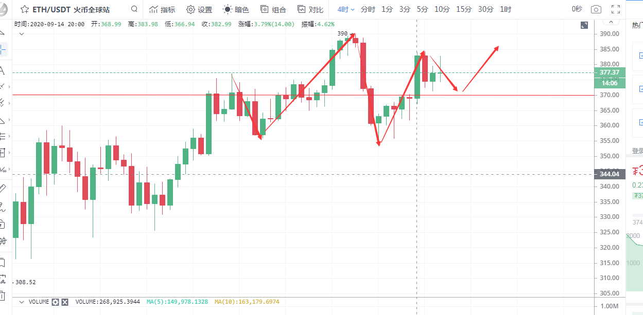 ETH行情分析:以太坊今日10点暴力拉升上行至382.8受阻回落,目前运行在378一线附近。日线上看,布林带呈张口状态,行情运行在布林带中轨下方,5日均线上穿10日均线于376一线运行,附图MACD有金叉之势,红色动能量持续缩量。