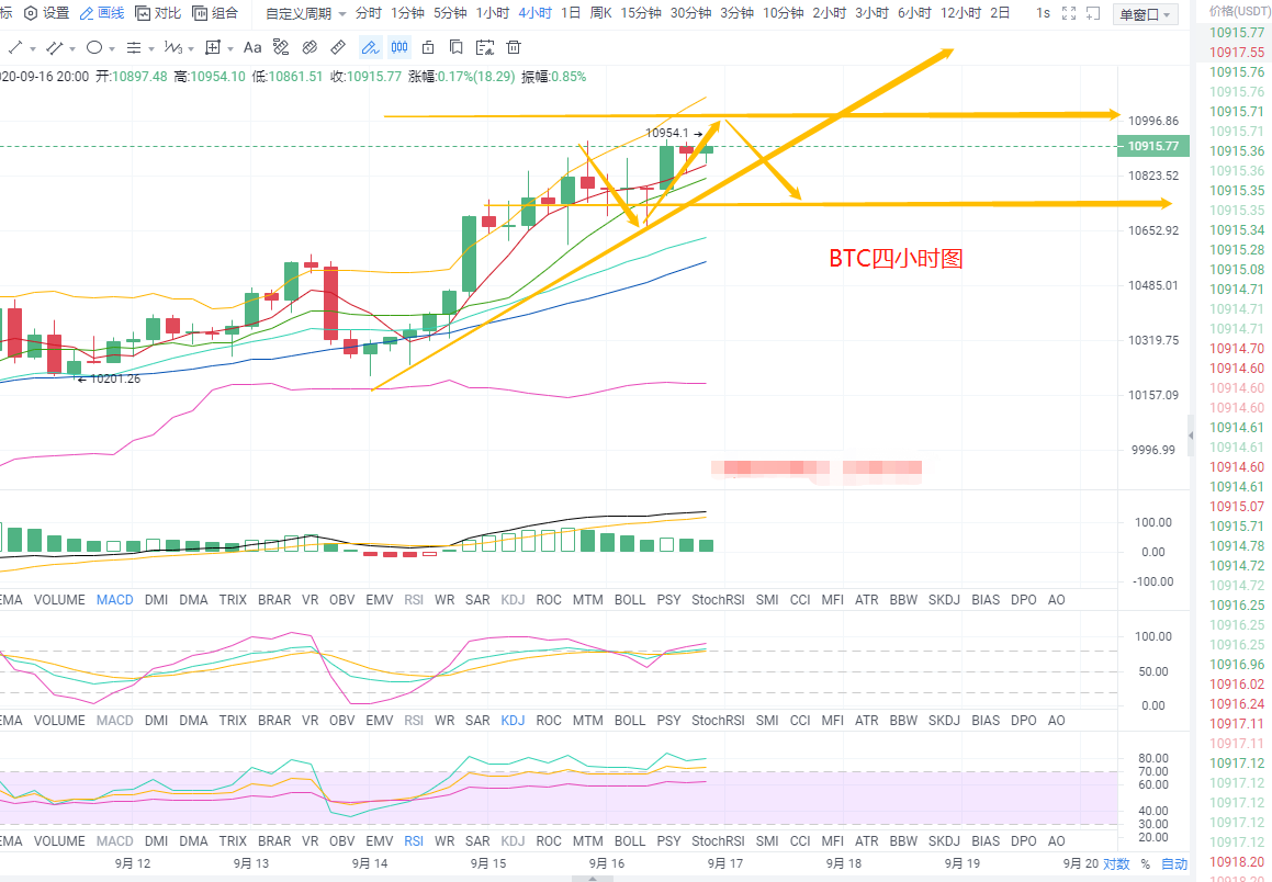 比特币四小时级别来看,晚间再次突破前高达到10954,目前在10900上下震荡。当前布林带通道呈开口状态,币价于中上轨之间运行,均线方面,中午强势上涨币价突破5-10日均线上方,下方各均线呈多头排列,指标方面,MACD快慢线于0轴上方移动,多头柱缩量,KDJ三线向上移动,RSI运行至超买区。