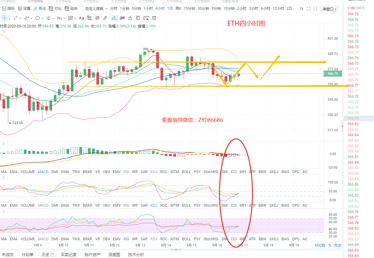以太坊四小时级别来看,布林带通道呈收口状态向下,币价于中下轨之间运行,均线方面:10日与30日均线死叉,5日均线于币价下方勾头向上,指标方面:MACD快慢线在0轴附近收口,空头柱缩量,KDJ三线由底部向上聚合,RSI三线聚合有金叉迹象,综合来看,当前多头趋势明显,上方阻力377,下方支撑356,晚间操作思路低多为主,高空为辅。