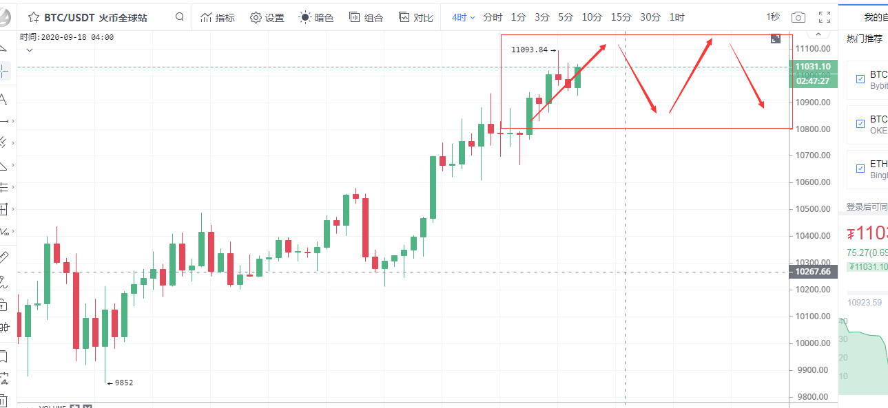 四小时线来看今日凌晨突破11000一线压制再次触及高点11093.84受阻回落,上方承压11100阻力压制,四小时上个周期收一根上影线很长的小阴线,短期上方承压布林带上轨阻力压制,K线短期下方获得30日均线10884支撑,各均线呈多头排列,大趋势偏向多头。小时图中5日均线下穿10均线,且幅图中,MACD双线死叉,红色动能柱,弱势加强,行情上涨缓慢。综合来看整体的走势是一个震荡上行。操作上彤欣老师个人建议行情高抛低吸。