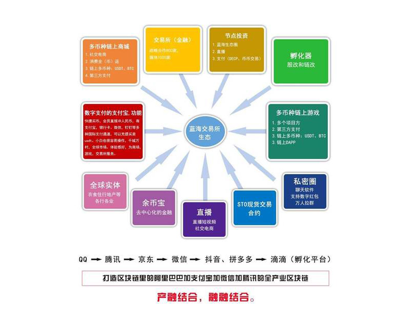 蓝海交易所全力出击,打造了一个全新的模式,即为“区块链里的阿里巴巴+支付宝+微信+腾讯”