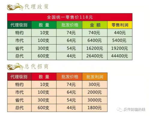 “代理也可以招收自己的下级代理,赚取管理费和差价。”某代理举例说,“省代”的拿货价54元,“总代”的拿货价44元。招收一个“省代”,“总代”就能从中赚取每支10元的差价,利润就是3000元。而“股东”招收一个“总代”每支差价10元,就是6000元利润。