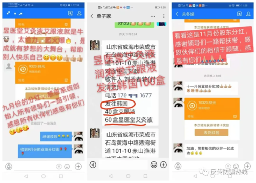 小锦表示,刚开始接触的时候,假中医就洗脑让她去卖或招代理。不过自己用了一直没有好转,也没有狠下心来去忽悠别人。“市场也并不像他们忽悠得那么好做,他们很多都是靠拉下线赚钱的,并不像他们嘴里说的帮助别人调理好身体再推荐做代理。很多人产品买回来就算自己销售不出去也会被洗脑洗的傻乎乎的用完。”小锦气愤的说。