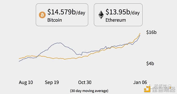 (比特币和以太坊每天的链上交易额,SOURCE:Bitinfocharts)