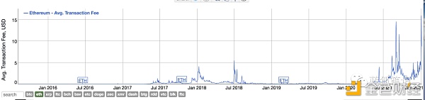 这几天的gas费用是疯狂的,拥堵时以太坊的gas价格甚至接近500Gwei,发送ETH接近10美元,在Uniswap和Sushiswap交易可能需要高达50多美元以上的手续费,而参与挖矿(如YFI)手续费甚至更高。1月4日以太坊平均交易费用高达15.957美元,这是极其昂贵的交易费用。