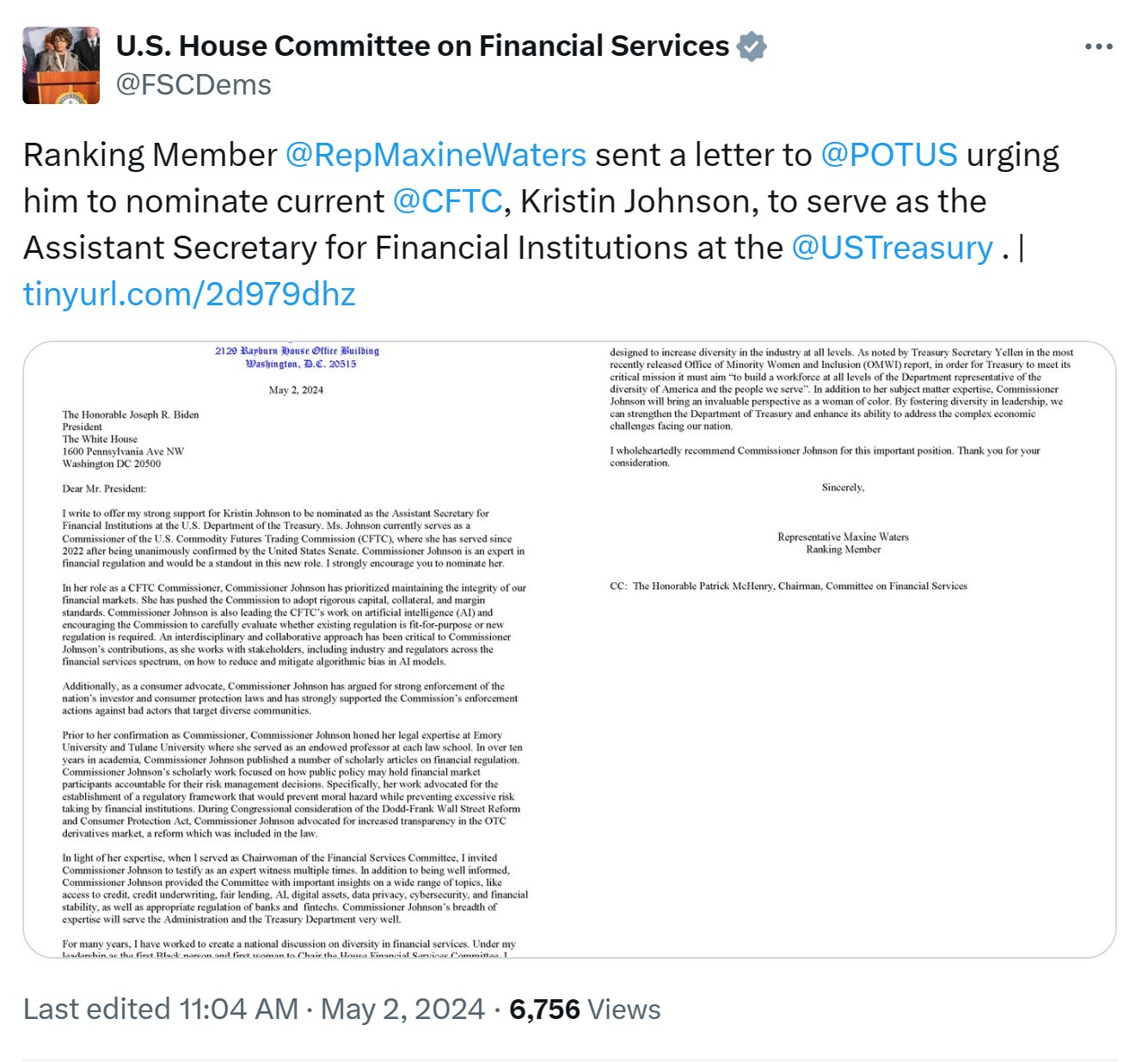 与此同时,金融服务委员会排名第一的众议员玛克辛-沃特斯(Maxine Waters)最近致信美国总统何塞-拜登(Jose Biden),建议提名约翰逊担任美国财政部金融机构助理部长一职。如果获得提名并获得批准,约翰逊将在制定与美国金融市场相关的立法和政策方面发挥关键作用。