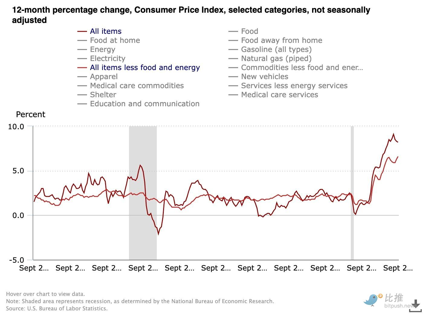 美国劳工部公布的数据显示,衡量通货膨胀的晴雨表 — 消费者价格指数(CPI)– 9 月份比去年同期上涨 8.2%,略高于经济学家预测的 8.1%,较 8 月上涨 0.4%;剔除波动的能源和食品价格的核心CPI上涨0.6%,与8月的涨幅相同,与去年同期相比上涨 6.6%,达到40年来的最高水平。