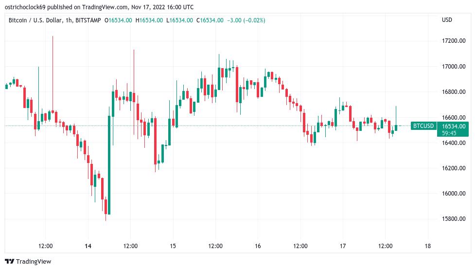 随着市场消化围绕交易所 FTX的最新事件,11 月 17 日的价格在 16,500 美元左右。