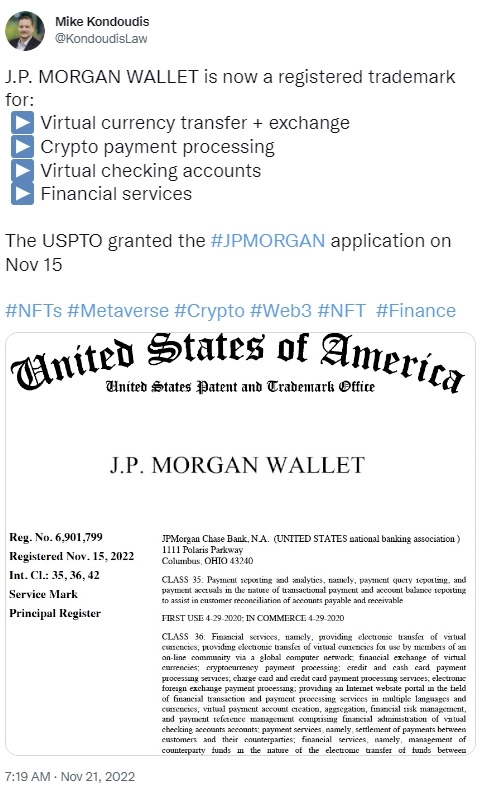 摩根大通银行已成功在美国专利商标局(USPTO)注册了一款钱包商标。获得美国专利商标局许可的商标代理人 Mike Kondoudis周一在推特上表示,“JP Morgan Wallet”现已成为注册商标。
