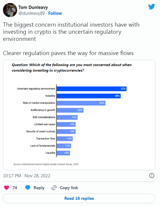 这位加密货币分析师引用了 Coinbase 赞助的 2022 年机构投资者数字资产展望调查,该调查发现超过一半的考虑投资加密货币的受访者对不确定的监管环境感到担忧。