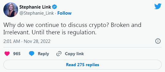 投资顾问 Hightower Advisors 的首席投资策略师兼投资组合经理斯蒂芬妮·林克 (Stephanie Link) 也呼吁加强监管,并表示在监管出台之前,加密货币是“破碎且无关紧要”的。
