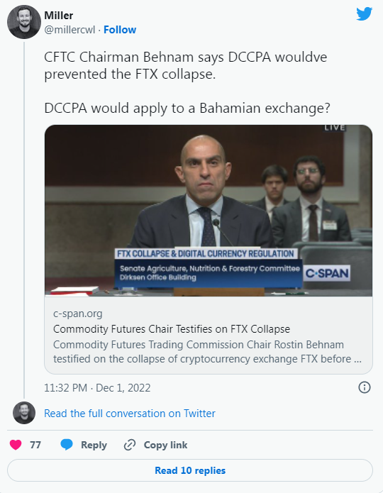我们知道如何做到这一点,”Behnam 说,试图解释崩溃是如何发生的:“作为监管者,我们都必须回答的问题总是:'你是如何让这种情况发生的?' 和“你将如何防止这种情况再次发生?” [...]如果没有 CFTC 的新授权,即使其他监管机构在其现有权限范围内行事,联邦监管框架仍将存在漏洞。”