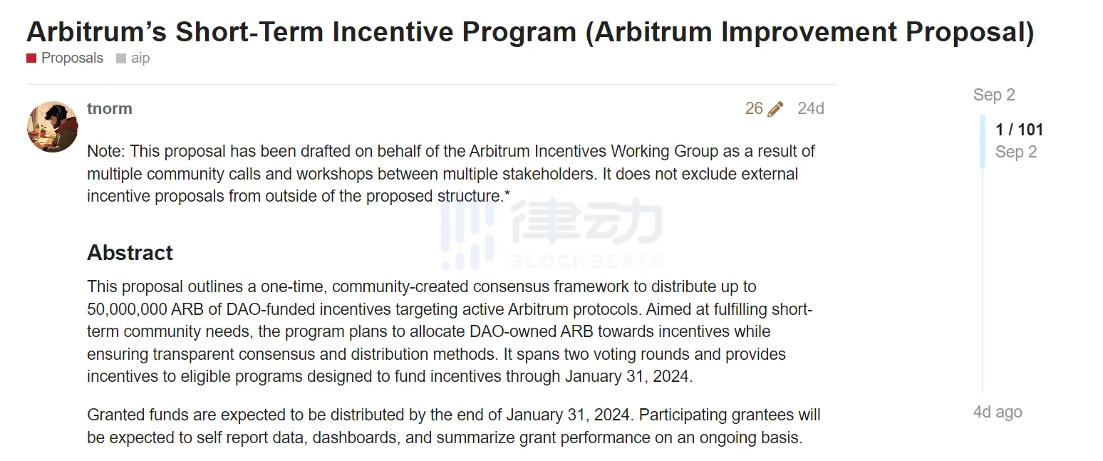 在 9 月 4 日报道,Arbitrum 激励工作组在 Arbitrum 社区论坛中提交「Arbitrum 短期激励计划」AIP 提案,该提案旨在从 DAO 财库中向活跃的 Arbitrum 协议分配最高 7500 万枚 ARB 的奖励,以满足社区的短期需求。